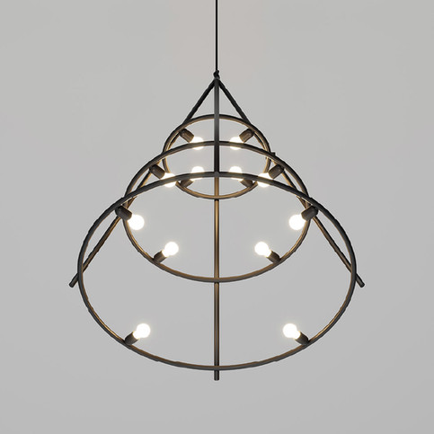 El Porís is a modern, light, rigorous chandelier, yet one that is also truly spectacular and sculptural. It is a large elementary, geometric structure that features light bulbs housed in traditional E27 sockets, leaving complete freedom of choice as to what sources to use. Two or three calendared steel tubes of decreasing diameter are united by four vertical mounts. The simplicity is immediately apparent, revealing design and production know- how that can solve the complexity in elements and details that disappear into the main structure.